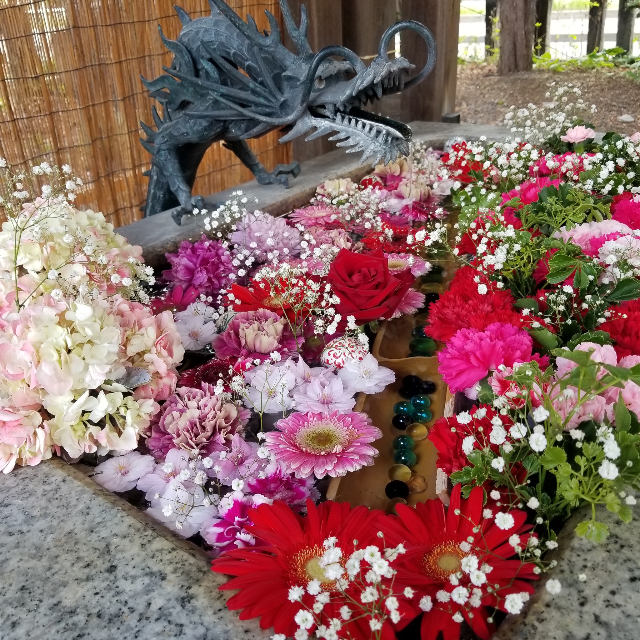 こちらの花手水も カーネーションが多くて